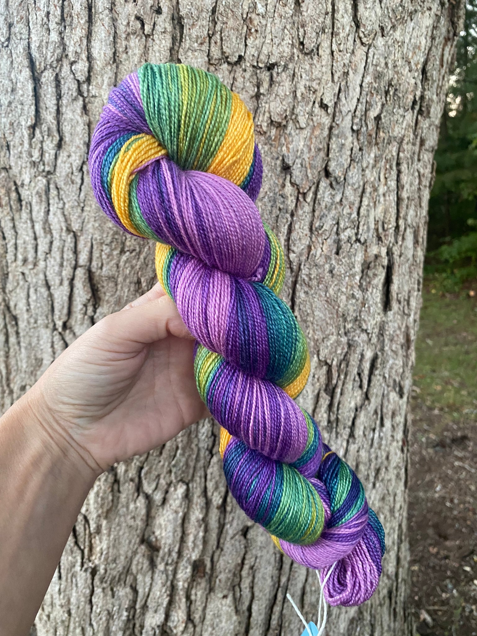 Hand dyed Yarn! This skein was hand dyed by me. Dyed in a Gradient so each color slides into the next. Great for making shawls. Due to the nature of my dyeing technique, my gradients tend to take on a heathered look. Colors are not always solid, giving the yarn a nice textured look without fancy stitching. Details of the yarn base are as follows: