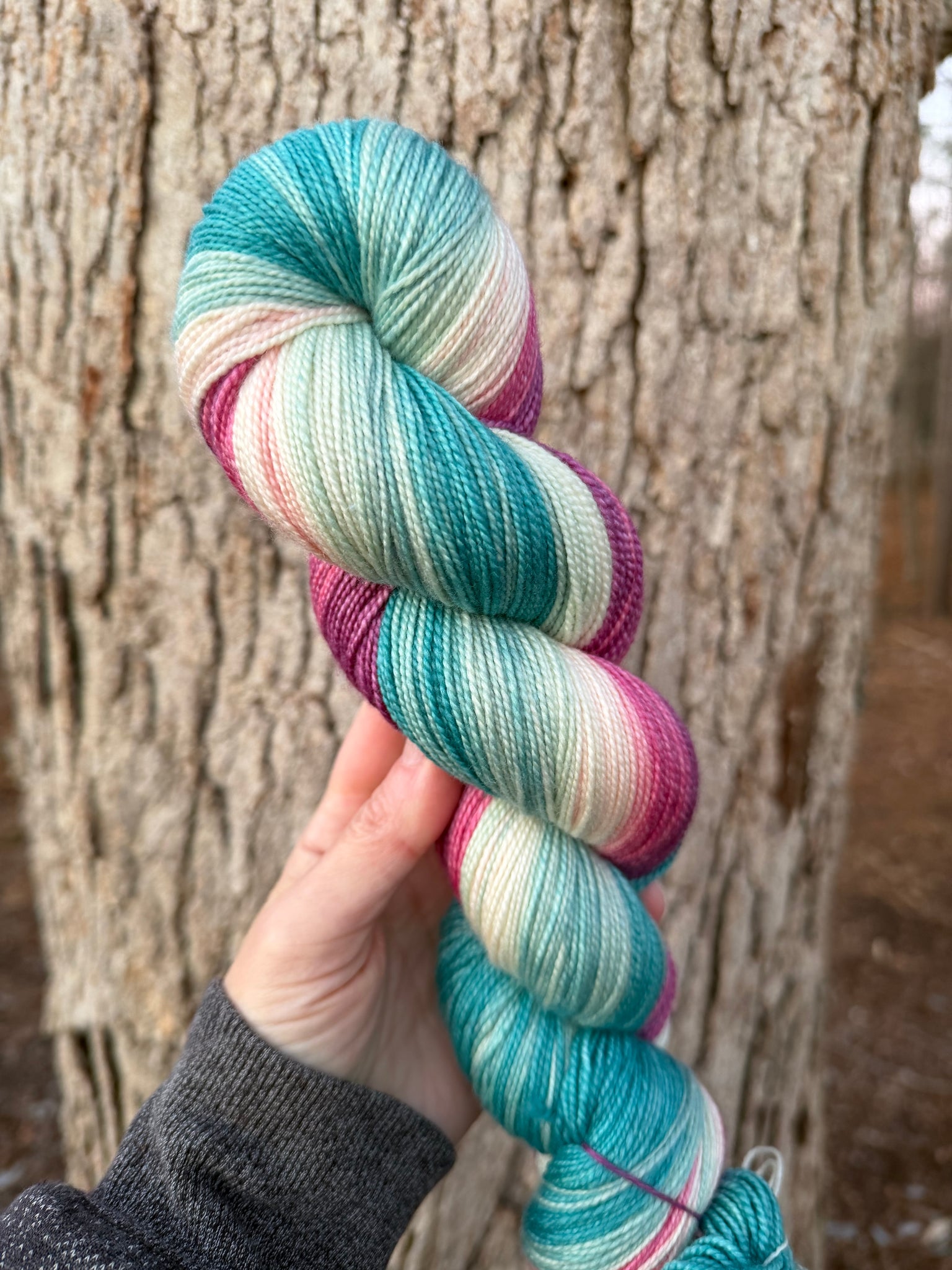 Gradient Dyed Yarn! This Hand dyed yarn runs from color to color. The soft changing of colors make knitting a shawl super fun! I love watching the colors deepen and change with every row. This is a larger skein of fingering yarn. Great for shawl making.